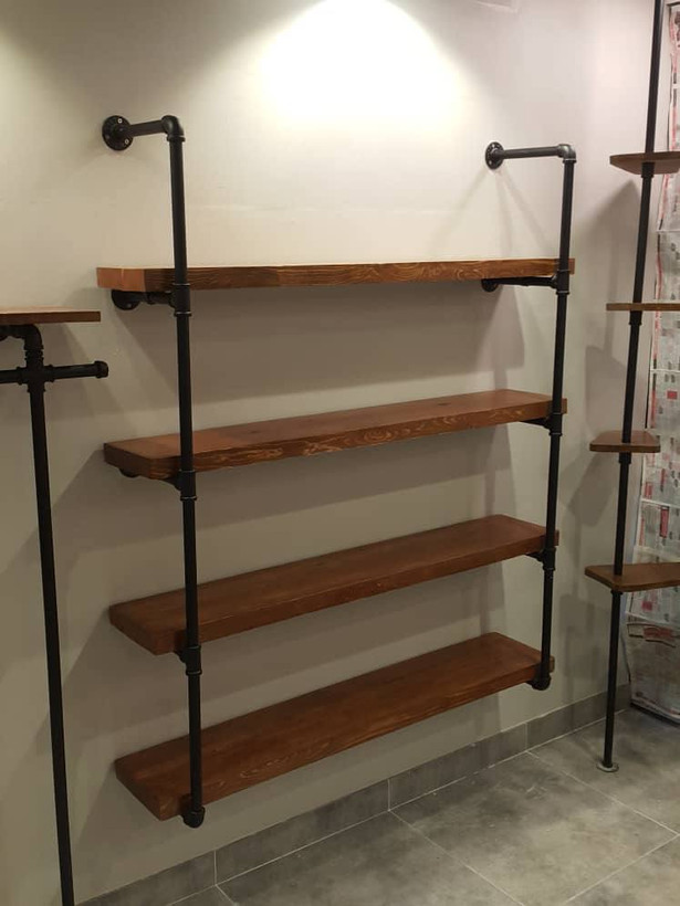 قفسه لوله ابی ۴طبقه ای متشکل از لوله و اتصالات مخصوص این محصول با ساختاری فوق العاده محکم با طبقات چوبی از جنس چوب روسی با رنگ قهوه ای فندقی،مناسب پوشاک،کفش،اقلام ورزشی،لوازم خانگی و ... ابعاد طبقات به شکل زیر است:طول طبقات ۱۲۰ عرض ۲۲ و ضخامت۴ونیم سانت_فاصله طبقات از هم ۳۵سانت میباشد.